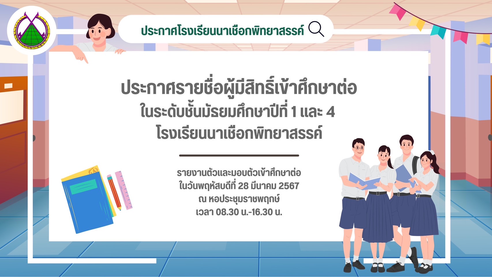 ประกาศรายชื่อ ผู้มีสิทธิ์เข้าศึกษาต่อ ในระดับชั้นมัรยมศึกษาปีที่ 4 ปีการศึกษา 2567