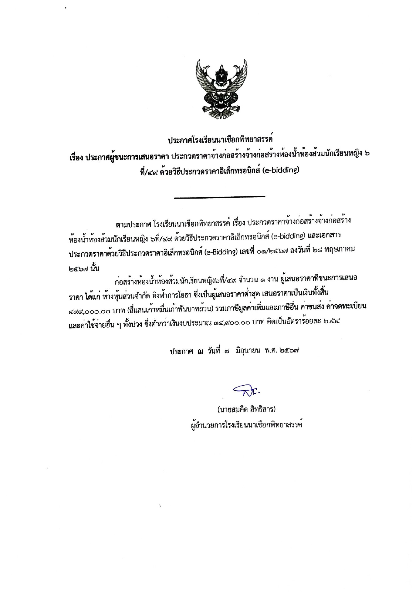 ประกาศผู้ชนะการเสนอราคา ประกวดราคาจ้างก่อสร้างห้องน้ำห้องส้วมนักเรียนหญิง ๖ที่๔๙ ด้วยวิธีประกวดราคาอิเล็คทรอนิกส์ (e-bidding)