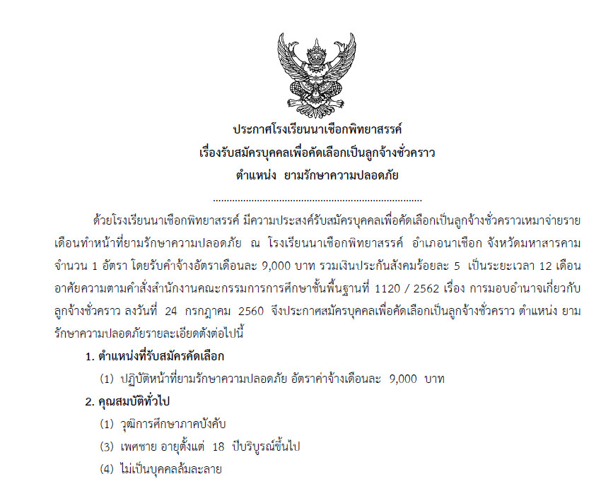 รับสมัครบุคคลเพื่อเลือกเป็นลูกจ้างชั่วคราว ตำแหน่ง ยามรักษาความปลอดภัย