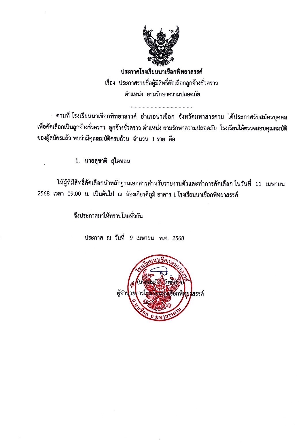 ประกาศรายชื่อผู้มีสิทธิ์คัดเลือกลูกจ้างชั่วคราว ตำแหน่ง ยามรักษาความปลอดภัย