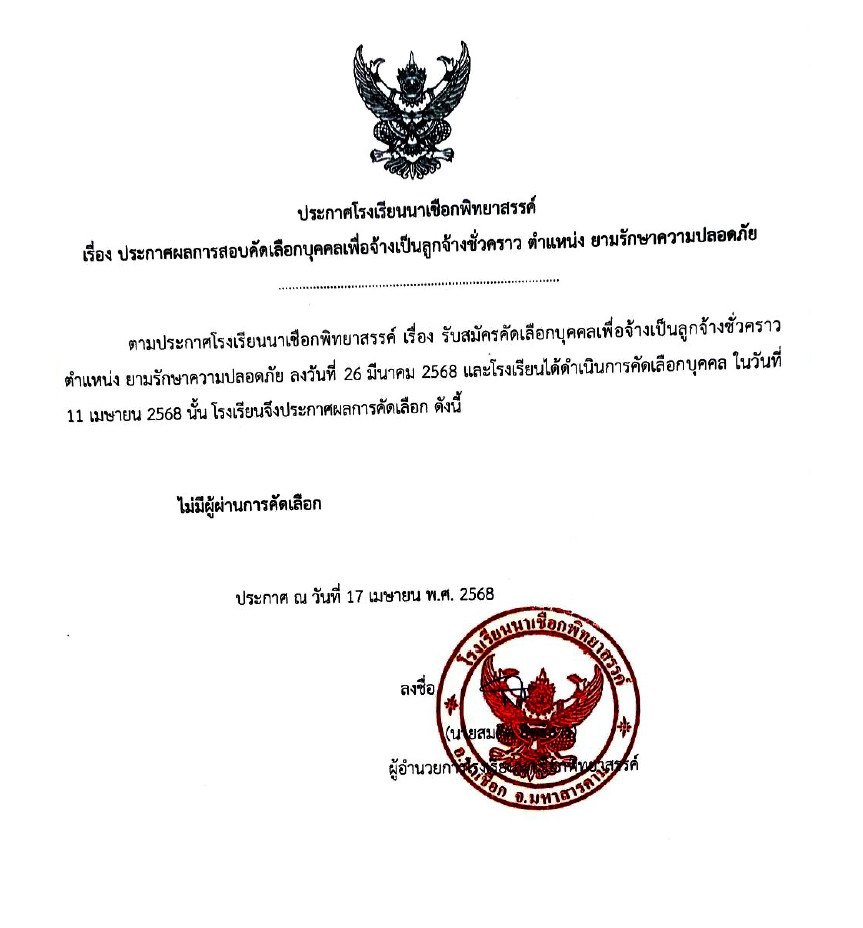 ประกาศผลการสอบคัดเลือกบุลลคเพื่อเป็นลูกจ้างชั่วคราว ตำแหน่ง ยามรักษาความปลอดภัย