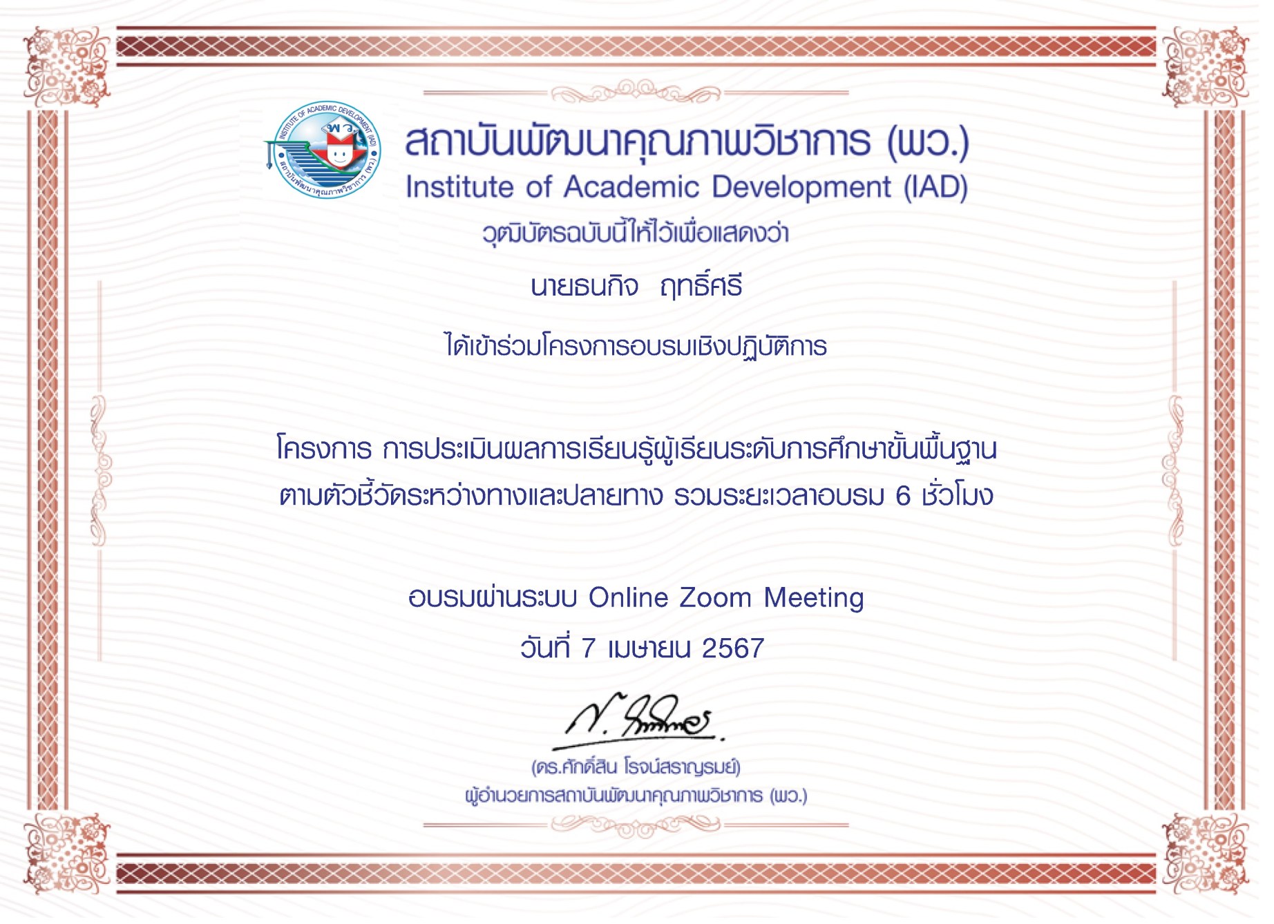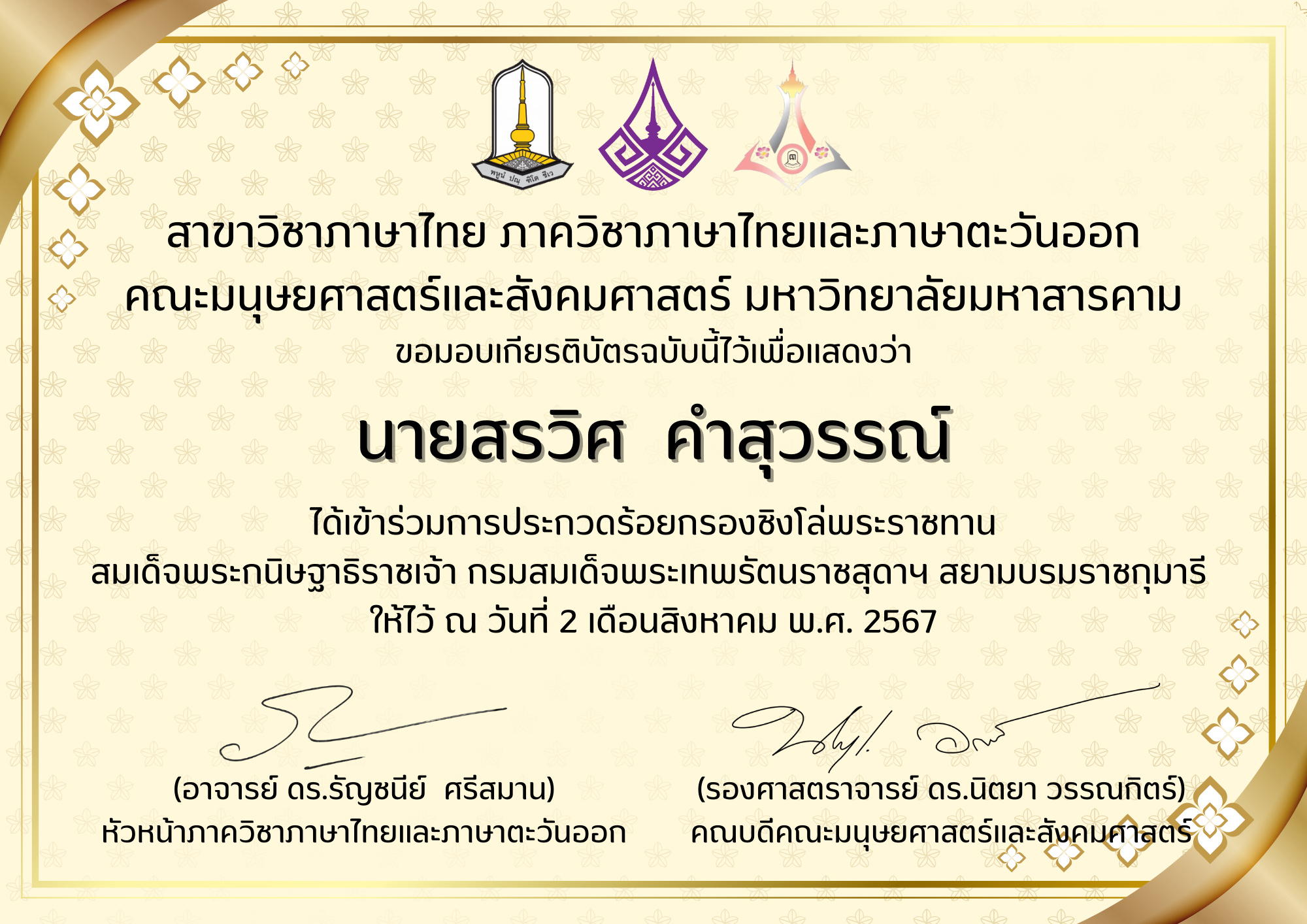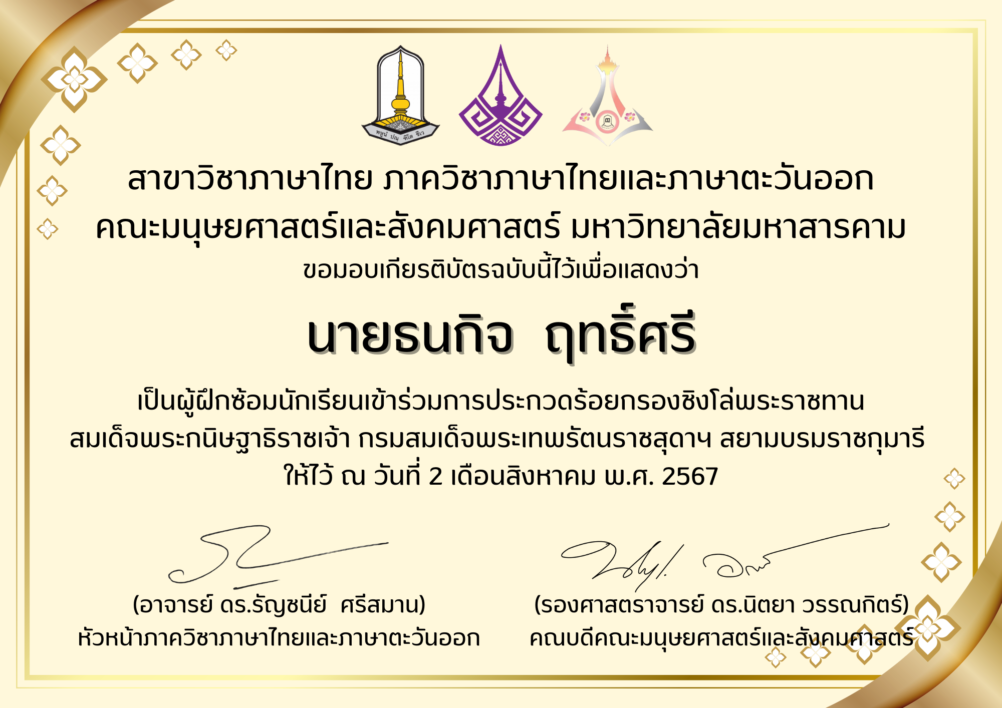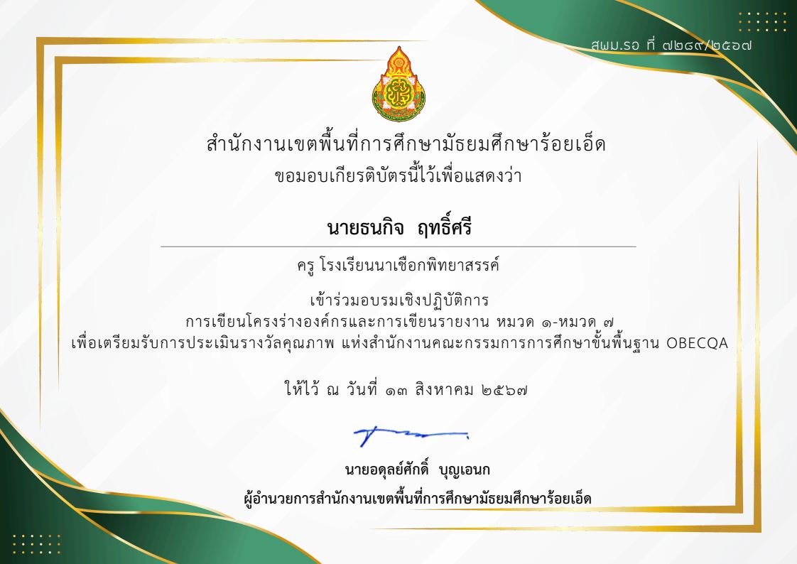 เกียรติบัตรครูผู้ฝึกซ้อม รางวัลชมเชย การประกวดแต่งคำประพันธ์ ระดับชาติ ประเภทมัธยมศึกษา โครงการวิวัฒนศึกษาอาเซียน อ่าน-เขียนบทกวี เฉลิมพระเกียรติพระบาทสมเด็จพระเจ้าอยู่หัว เนื่องในโอกาสพระราชพิธีมหามงคลเฉลิมพระชนมพรรษา 6 รอบ 28 กรกฎาคม 2567 |