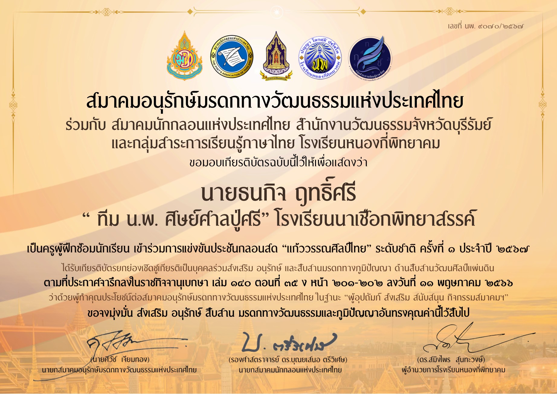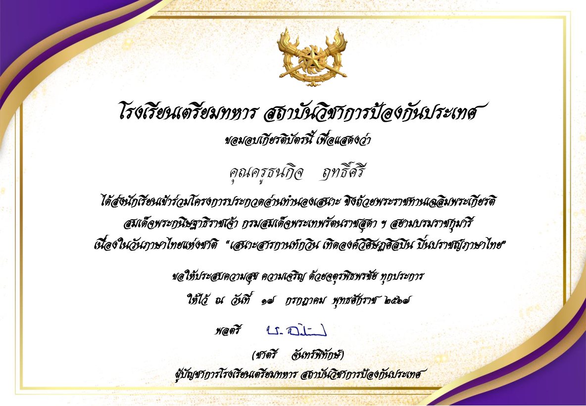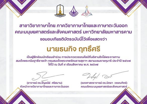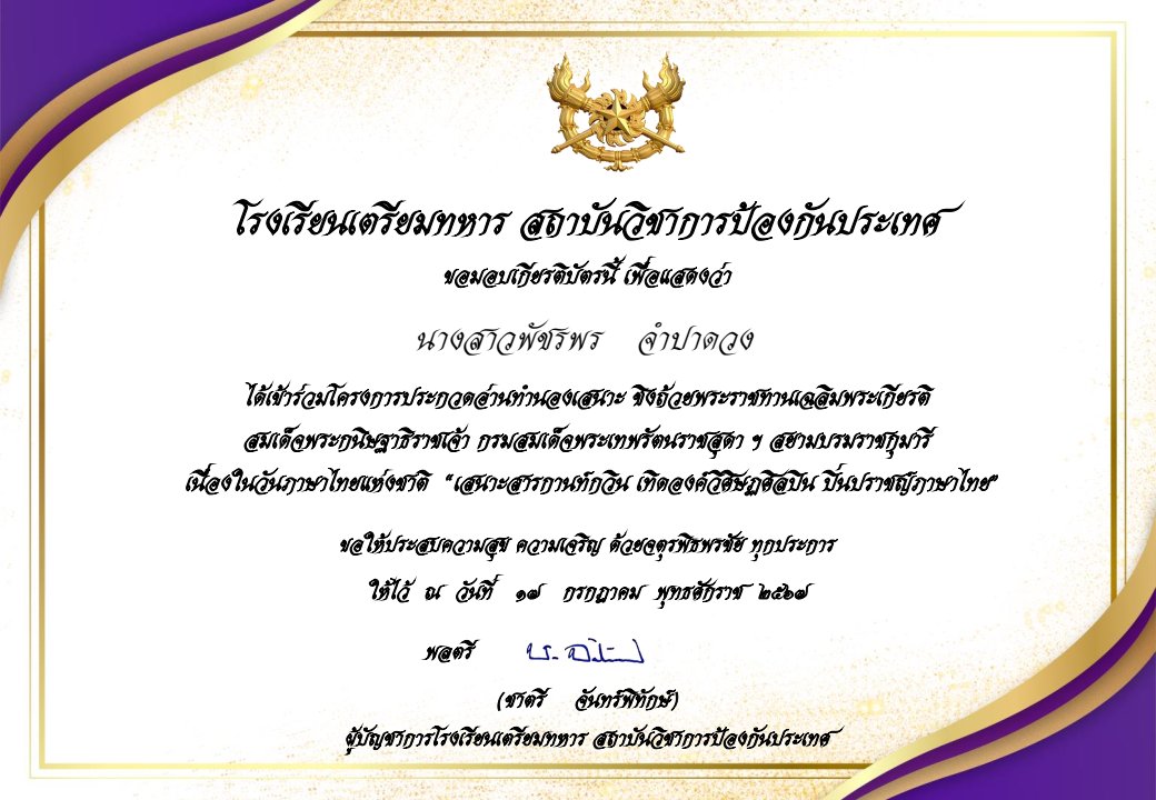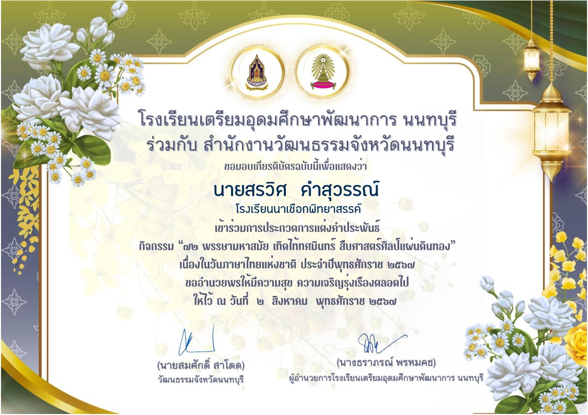 เกียรติบัตรนักเรียน รางวัลชมเชย การประกวดแต่งคำประพันธ์ ระดับชาติ ประเภทมัธยมศึกษา โครงการวิวัฒนศึกษาอาเซียน อ่าน-เขียนบทกวี เฉลิมพระเกียรติพระบาทสมเด็จพระเจ้าอยู่หัว เนื่องในโอกาสพระราชพิธีมหามงคลเฉลิมพระชนมพรรษา 6 รอบ 28 กรกฎาคม 2567 |