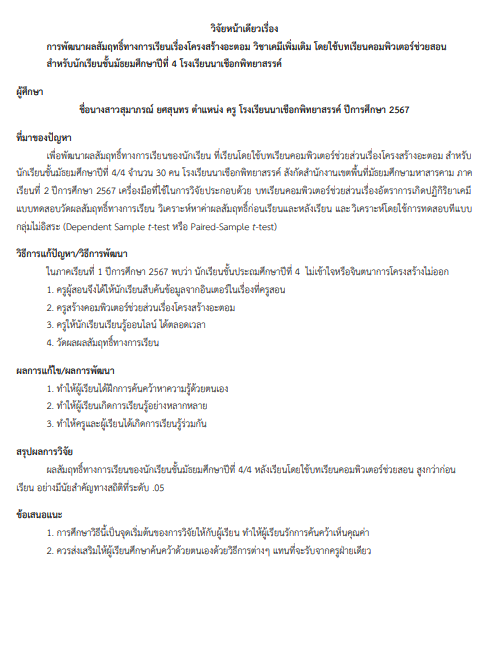 วิจัยในชั้นเรียน - ครูสุมาภรณ์ ยศสุนทร โรงเรียนนาเชือกพิทยาสรรค์ เลขที่ 10 ถ. นาเชือก-พยัคฆภูมิพิสัย ต.นาเชือก อ.นาเชือก จ.มหาสารคาม 44170