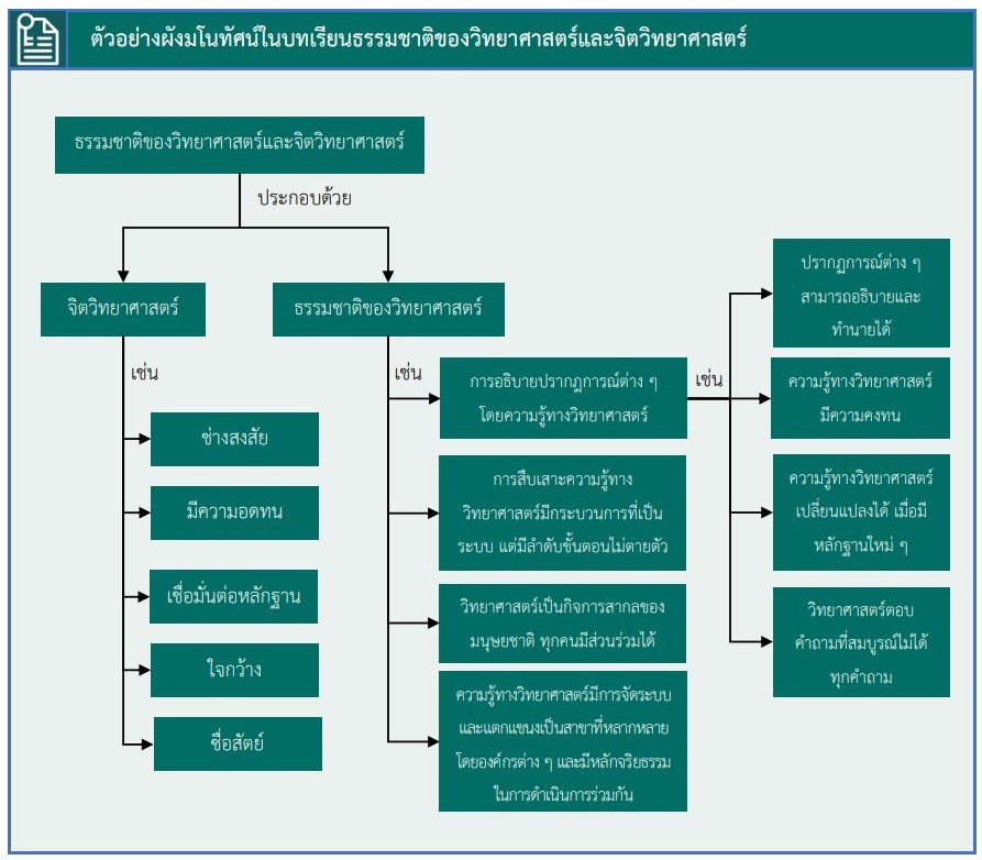 ให้นักเรียนเขียนผังมโนทัศน์ในบทเรียนธรรมชาติของวิทยาศาสตร์และจิตวิทยาศาสตร์ ดังตัวอย่างด้านล่างนี้ลงในสมุด