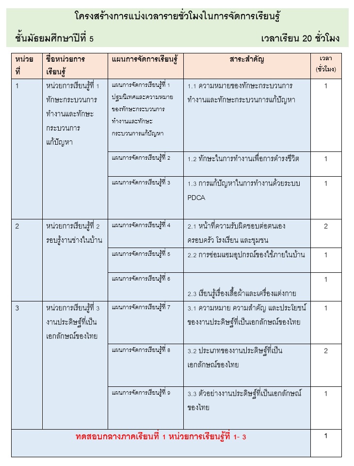โครงสร้างการแบ่งเวลารายชั่วโมงในการจัดการเรียนรู้