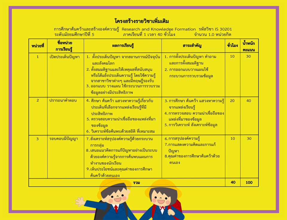 โครงสร้างรายวิชาเพิ่มเติม การศึกษาค้นคว้าและสร้างองค์ความรู้ Research and Knowledge Formation รหัสวิชา IS 30201
