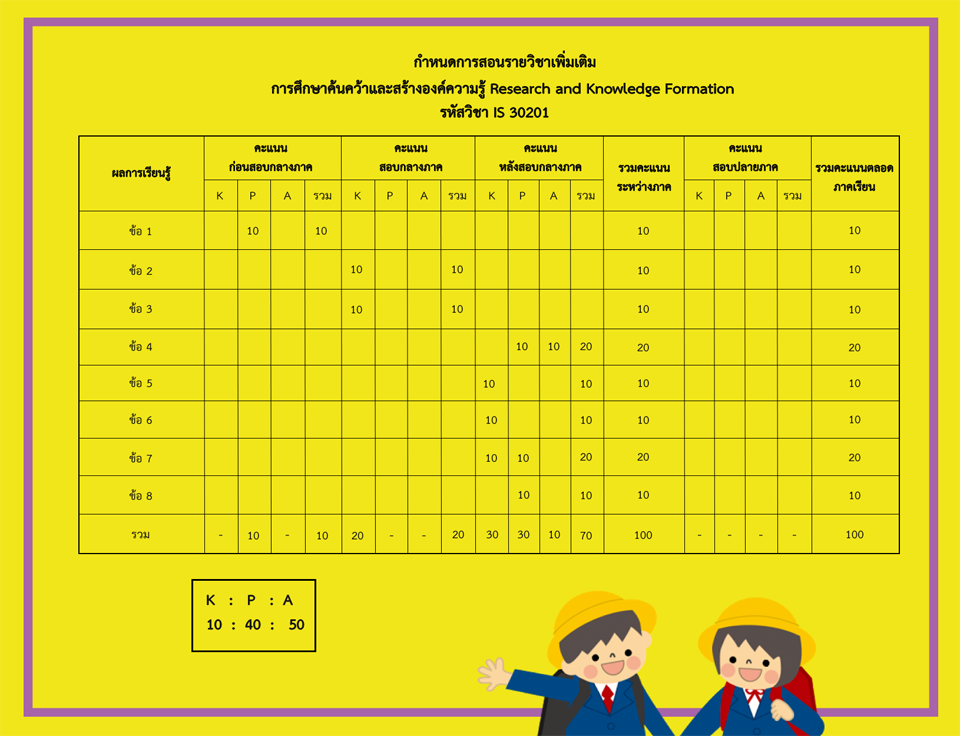 กำหนดการสอนรายวิชาเพิ่มเติม การศึกษาค้นคว้าและสร้างองค์ความรู้ Research and Knowledge Formation รหัสวิชา IS 30201