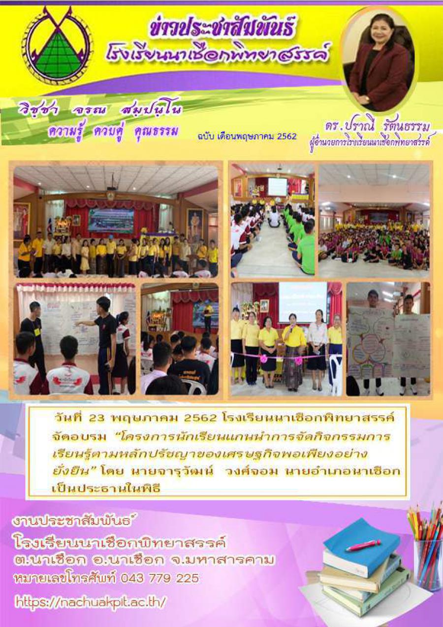 วันที่ 23 พฤษภาคม 2562 จัดอบรม โครงการนักเรียนแกนนำการจัดกิจกรรมการเรียนรู้ตามหลักปรัชญาของเศรษฐกิจพอเพียงอย่างยั่งยืน